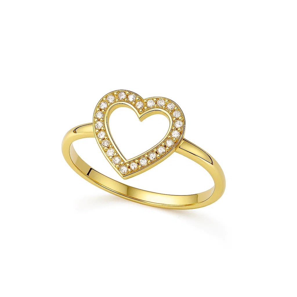 Um símbolo de amor eterno em forma de joia! Este anel delicado apresenta um coração vazado, contornado por zircônias brancas que irradiam brilho e elegância. O banho em ouro 18k garante um acabamento sofisticado e resistente, perfeito para quem busca um acessório atemporal com toque moderno e romântico.