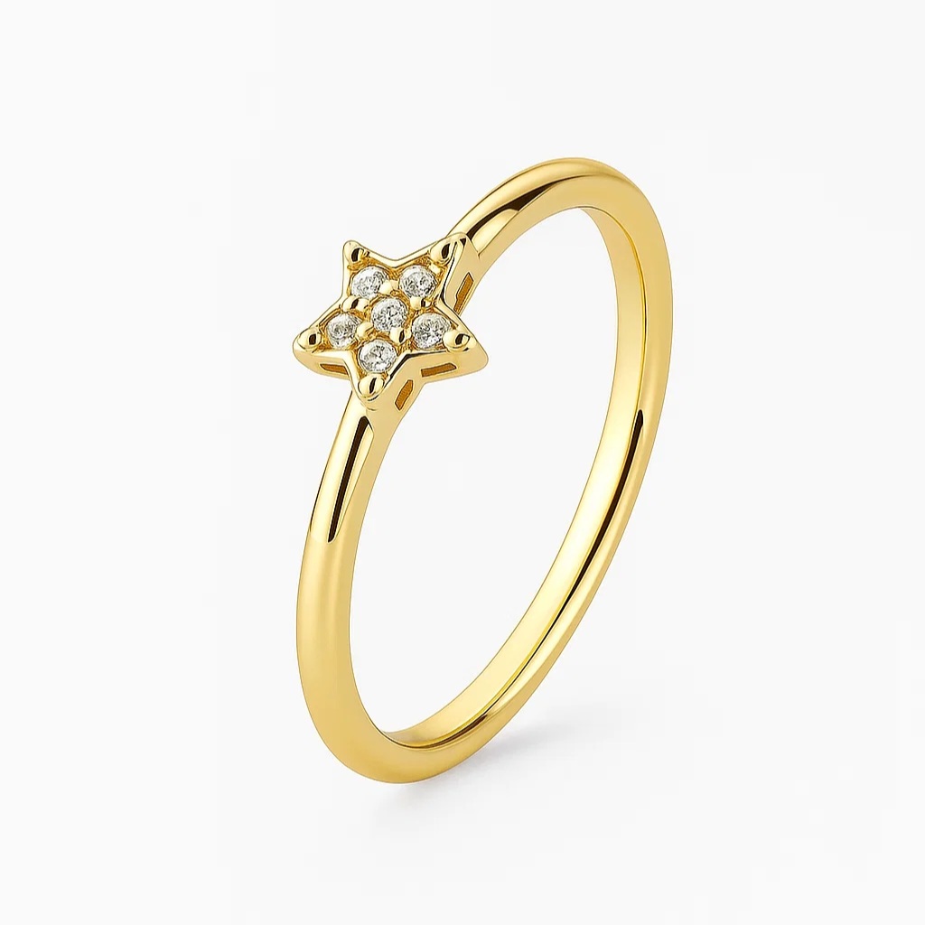 Anel encantador com design de estrela, cravejado com delicadas zircônias que irradiam brilho e sofisticação. Banhado a ouro 18k, combina um acabamento impecável com um toque de charme celestial. Perfeito para quem busca um acessório único e cheio de estilo, ideal para iluminar qualquer look com elegância e personalidade.