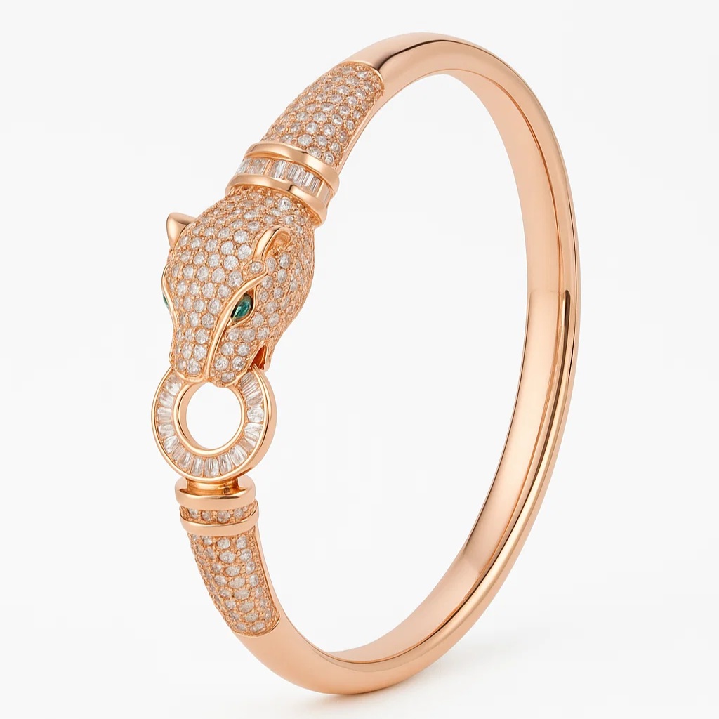 Bracelete folheado a ouro 18k com design imponente de tigre, cravejado com zircônias brilhantes. Uma peça sofisticada que une força e elegância, ideal para quem busca um acessório marcante e cheio de personalidade. Perfeito para compor looks ousados e refinados.