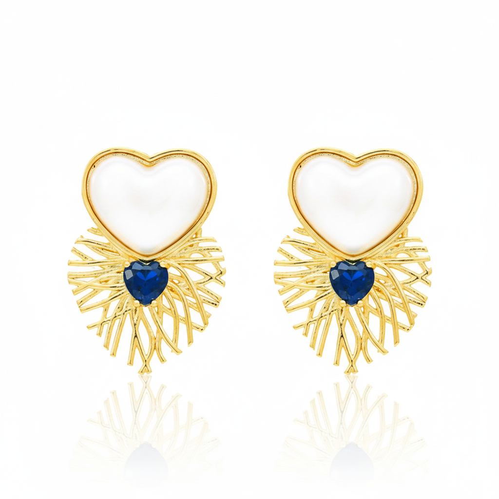 Brinco Design Coração Zircônia Azul Folhado a Ouro 18k