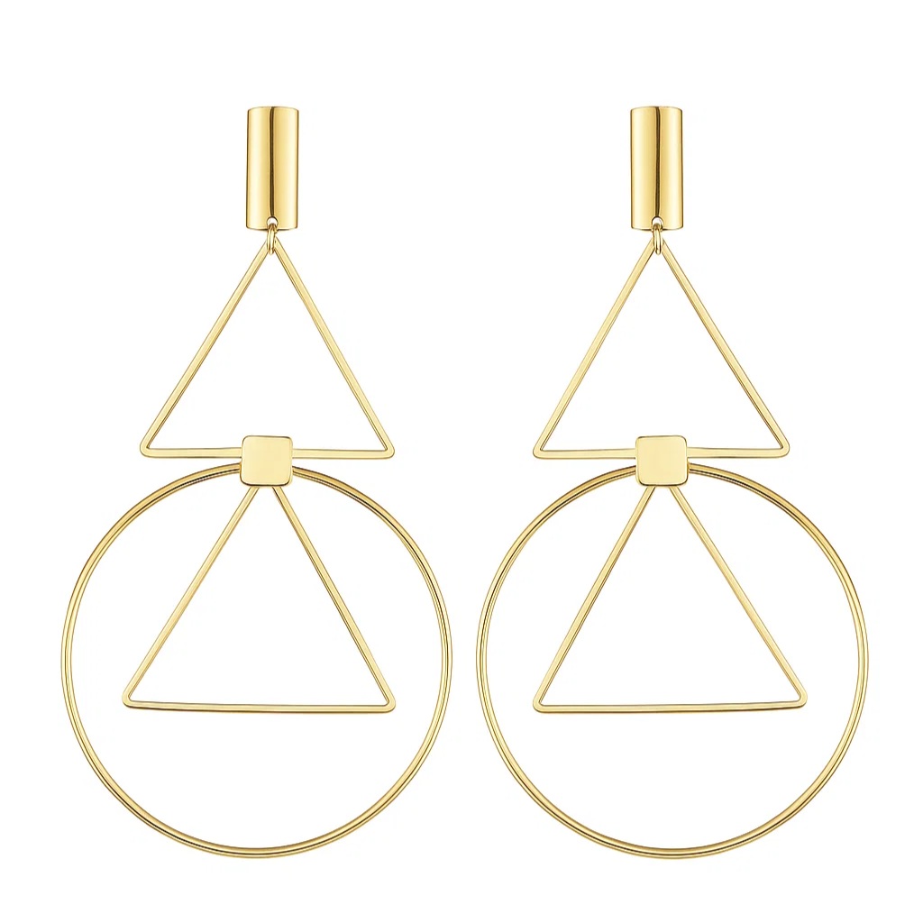 Moderno, ousado e cheio de personalidade, o Brinco Geométrico Maxi é a escolha perfeita para quem busca estilo com sofisticação. Com design arrojado em formatos triangulares e circulares vazados, essa peça combina minimalismo com impacto visual. O banho de ouro 18k confere um acabamento luxuoso e brilho duradouro.