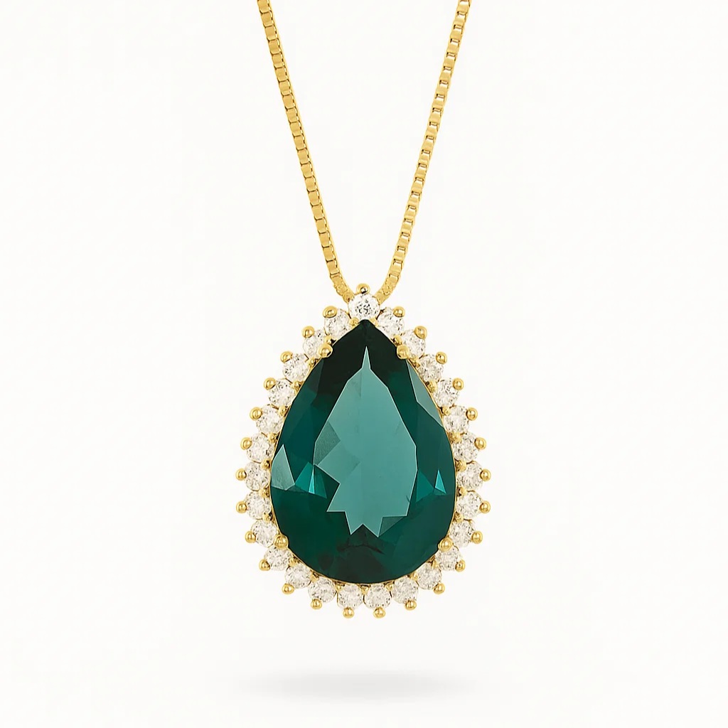 O destaque deste colar está no pingente em formato de gota, com uma pedra verde vibrante no centro. A pedra verde é rodeada por zircônias cintilantes, que realçam sua beleza e criam um brilho cativante. A combinação do pingente reflete a harmonia perfeita entre o frescor da cor verde e o glamour das zircônias.
