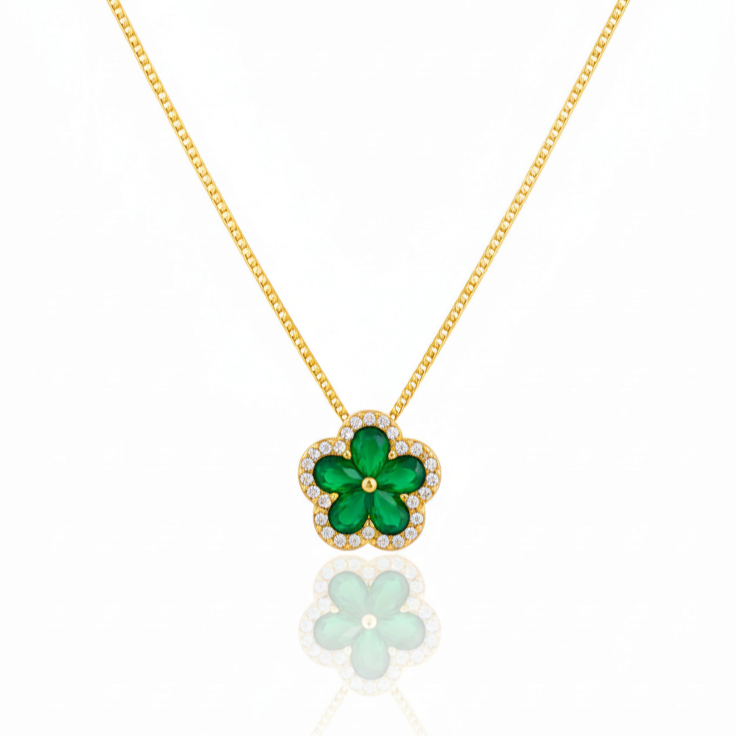 O Colar Flor Esmeralda é a união perfeita entre sofisticação e delicadeza. Seu pingente em forma de flor com zircônia colorida, composto por pedras verdes em corte lapidado e rodeado por microzircônias brilhantes, transmite elegância e charme em cada detalhe. A estrutura banhada a ouro 18K garante durabilidade, brilho intenso e um acabamento de luxo que valoriza ainda mais a peça.