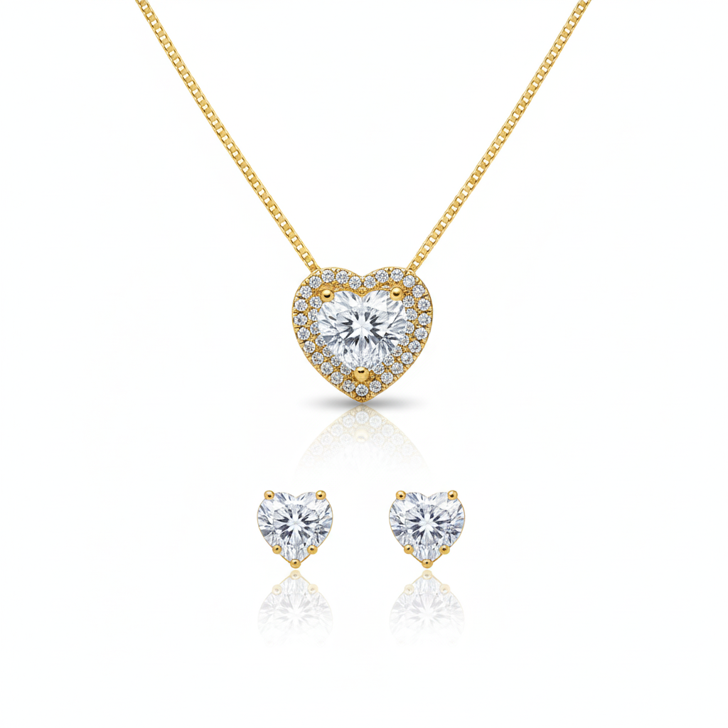 Encante-se com a elegância do Conjunto Coração Cristal, composto por um colar e par de brincos com design romântico e sofisticado. As pedras centrais em formato de coração são envolvidas por microzircônias que intensificam o brilho e garantem um visual deslumbrante. Uma joia delicada e atemporal que valoriza qualquer ocasião.