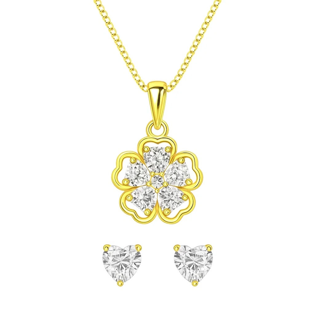 Delicado e encantador, este conjunto traz o equilíbrio perfeito entre sofisticação e romantismo. O colar possui um pingente em formato de flor com pétalas formadas por zircônias em corte coração, que proporcionam brilho intenso e um toque de elegância. Os brincos solitários complementam a composição com discrição e charme.