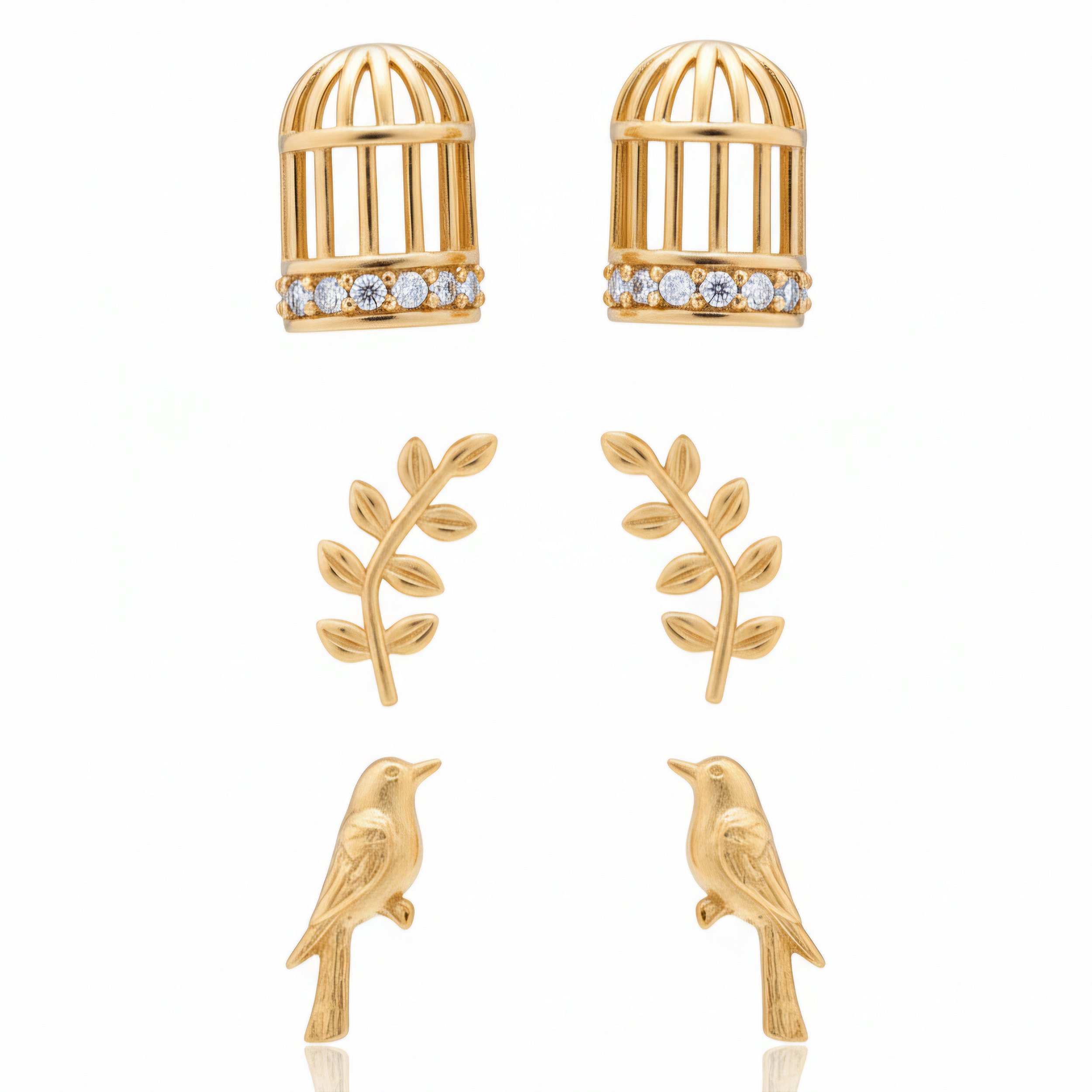 Esse kit é perfeito para você que ama a natureza e tudo aquilo que lembra a delicadeza! Brinquinhos super fofos e apaixonantes! Kit de brincos com uma gaiola de zircônia, folha e um passarinho, compostos por pequenos pontos de luz, ideais para deixar a peça ainda mais perfeita e lindíssima!