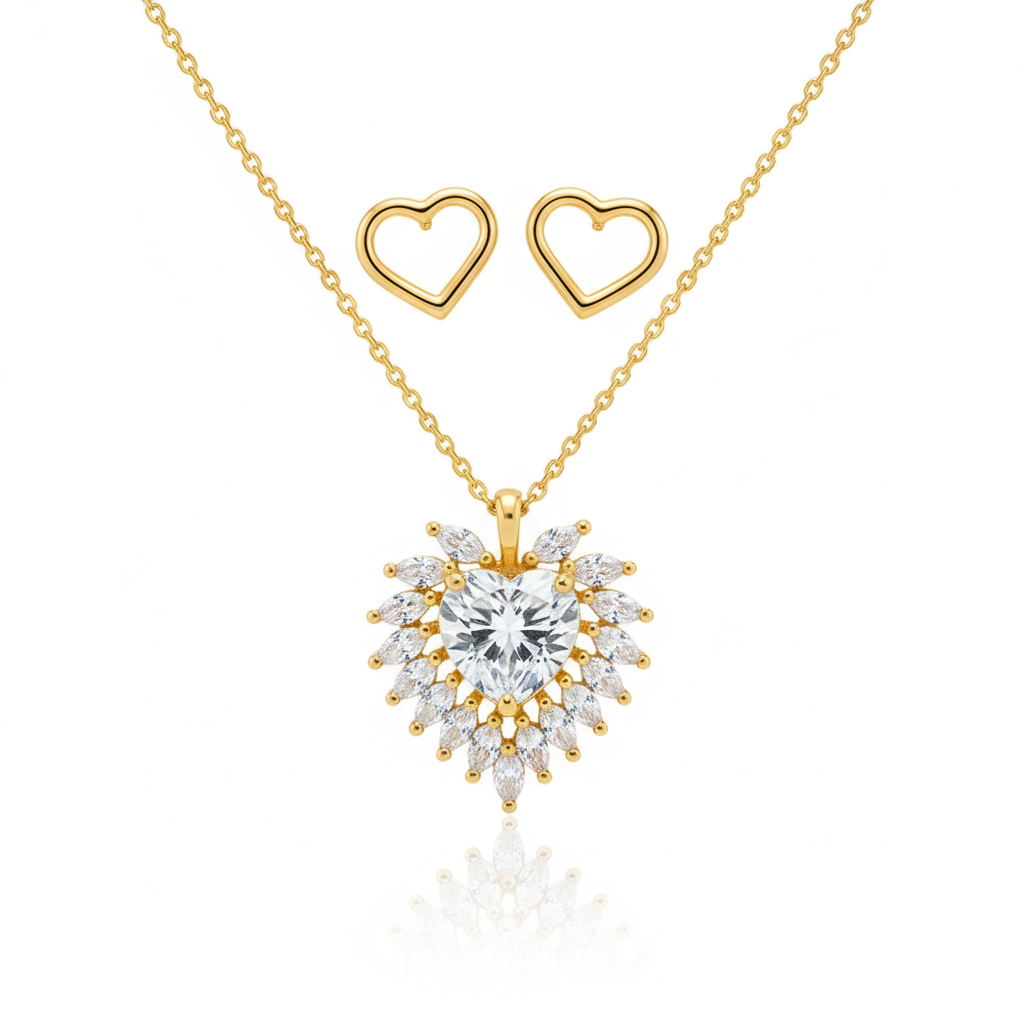 Surpreenda-se com o charme do Conjunto Coração Radiante. O colar com pingente em formato de coração cravejado com zircônias cintilantes é o destaque desta semijoia, acompanhado por delicados brincos de coração vazado que completam o visual com leveza e romantismo. Cada detalhe foi pensado para refletir sofisticação e brilho, ideal para ocasiões especiais ou para iluminar seu dia a dia.